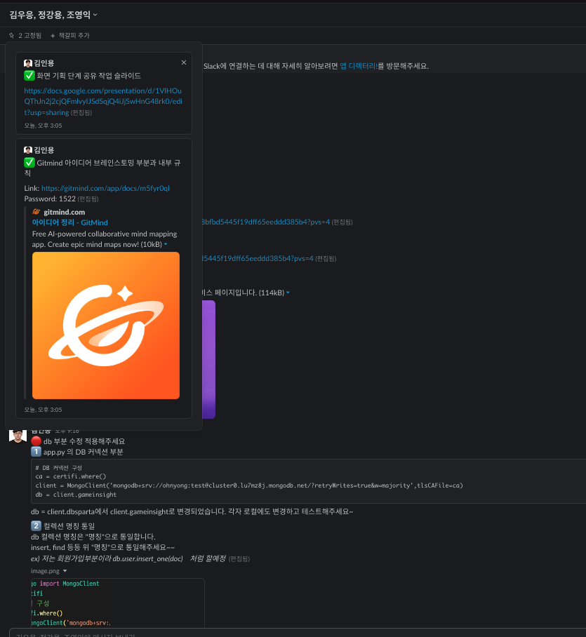 개발 기간은 3일이지만 사실상 아이디어 창출을 위한 브레인스토밍 반나절, 문서화 2~3시간을 사용했고, 나는 팀장으로써 이전 경험들을 토대로 좀 더 원활한, 안정적인 프로젝트 시작을 위해서 공통 환경 구축, 그라운드 규칙, 개요, 커뮤니케이션 툴, 협업 툴을 체크하고 미숙한 부분이 있으면 핵심적인 부분의 사용법과 간단한, 알기 쉽도록 안내하느라 반나절이 다 지나갔다. 추후 기초적인 발표 준비와 배포 과정까지 생각해야 되서 사실상 3일이 아니라 하루만에 작업을 완료해야 되는 상황이다. 하지만, 비교적 짧은 기간에 각자 맡은 부분을 최선을 다해서 구현해보자는 목표를 가졌다. 또한 아이디어 창출, 기획, 배포, 정리 까지도 개발의 한 부분이다. 사실상 맘편히 쉽게 연습 할 수도 있었지만 우린 마치 마감일이 코앞에 다가와서 프로젝트를 단숨에 끝내야 되는 상황을 스스로 자처한 것이다.