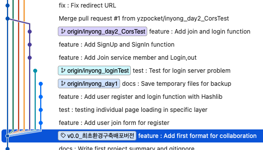 아직도 아쉬운 점은 "기능별" Branch 생성이다. 아직까지도 day_1, day_2처럼 전체적으로 영향을 주는 형상관리를 진행하고 있었다. 이는 당장 급하게 형상관리에 대하여 팀원들에게 알려주는데 급급해서 해당 부분을 인지했음에도 버릇처럼 실수해버렸다. 물론 팀원별로 애초에 기능을 구분했기 때문에 이름으로 구분하는것 자체가 그 기능에 대한 branch생성으로 우회해서 생각 할 수 있지만 근본적으로 좀 더 "branch의 목적"에 맞게끔 사용했어야 했다. 나 또한 Login, Logout, Join 처럼 기능을 분리해서 관리했어야 했다. 다음 프로젝트에서는 무조건 "기능"에 따라서 Branch를 관리해야 겠다. Branch를 이렇게 하지 마라! 기능으로 구분하자!! Branch명 = 기능!! ex) Login Branch를 Merge하면 Master에 Login 기능이 생기는 것이다! 아직도 궁금한 점은 실무자들이 현업에서 이러한 형상 관리 부분을 어떻게 진행하는지, Pull-Request에 대한 메시지를 어떻게 작성하는지 실제 실무자들의 진행 과정을 어깨넘어로 보고 싶은 궁금증이 생겼다.