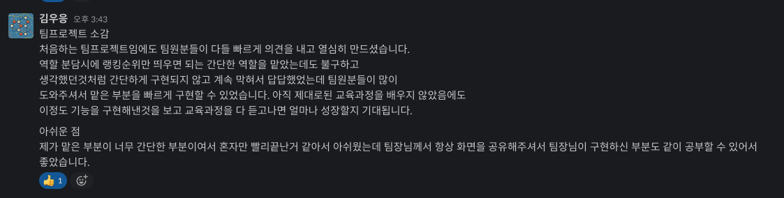 팀원 모두 잘 따라와줬고 너무 합이 잘맞는 팀원들이었다. 무슨 기능을 더해보지 계속해서 욕심을 가진 사람들이 모였었고 생각하는 방향이 일치해서 더욱 추진력을 얻어서 다들 열심히 참여했었다. 개발에 대한 열정이 높았지만 제한된 시간이 아쉬웠고, 좀 더 치밀한 프로젝트를 하고 싶은 팀원들이었다.