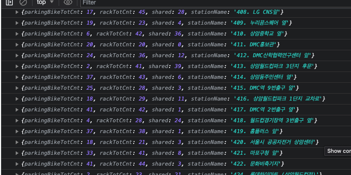 개발자도구의 console로 데이터가 정상적으로 들어오는 것이 확인된다.