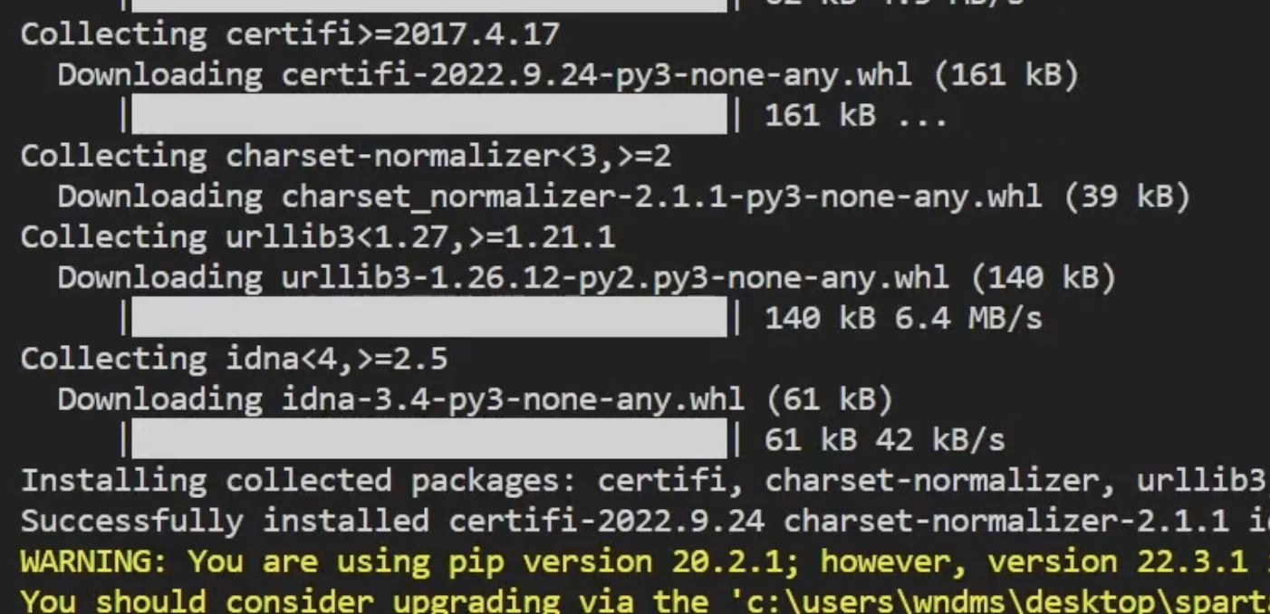 venv 가 활성화된 터미널에서 아래 커맨드로 requests란 라이브러리를 설치한다.