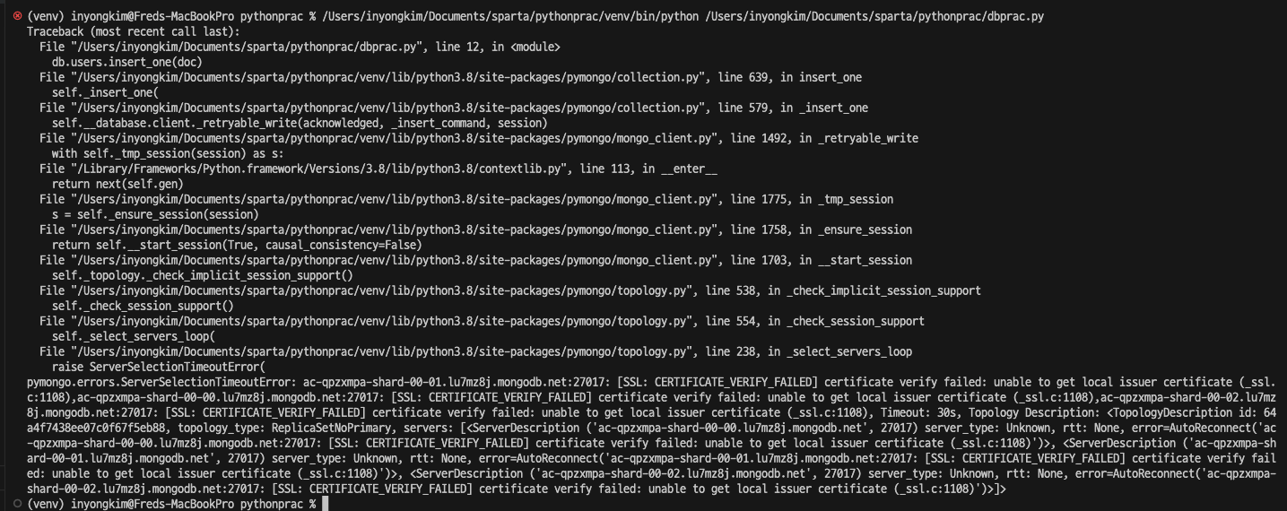 [Python][Database] MongoDB Atlas(Cloud)와 Python 연결 dnspython , pymongo 라이브러리 + SSL: CERTIFICATE_VERIFY_FAILED 에러 해결 본문