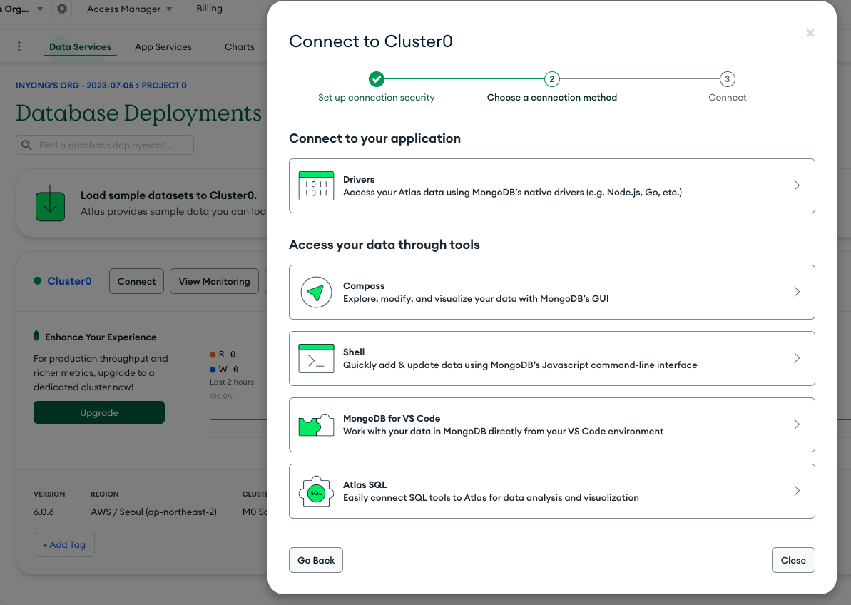 Atlas에 들어가서 준비해둔 DB에서 Connect 버튼을 누르고 다음과 같이 세팅한다.