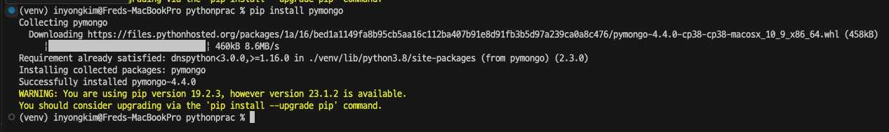 마찬가지로 VSCode 터미널에서 pymongo를 설치한다