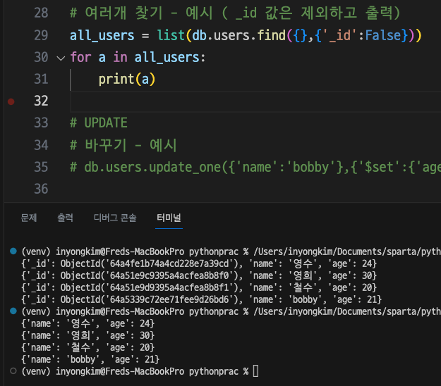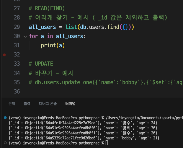 ohnyong 2023. 7. 5. 18:41파이썬에서 MongoDB를 사용하면서 CRUD기능의 SQL문을 사용하는 것을 실습해보았다.