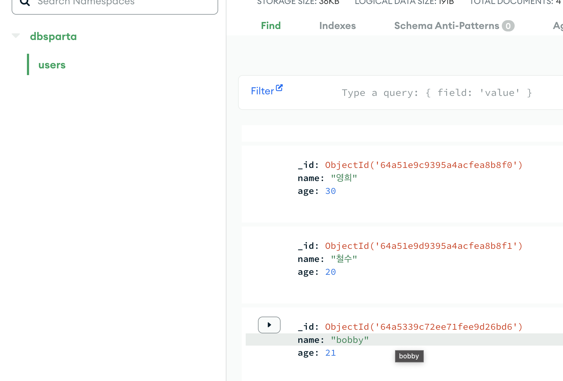db에 4번째 document였던 bobby에 대한 데이터가 삭제되었다.