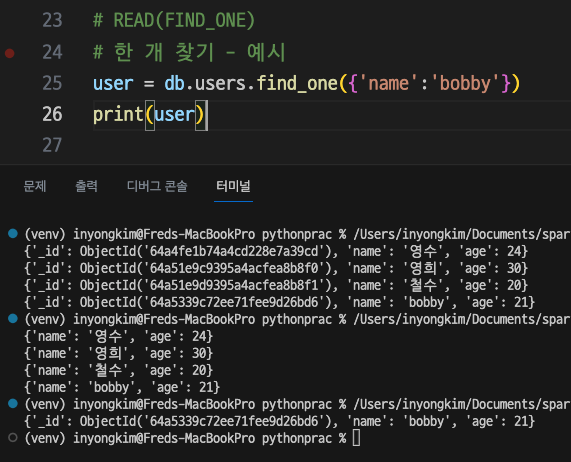 * 1개만 찾기 find_one