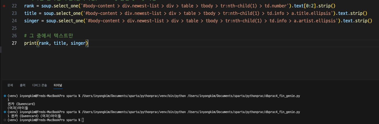 이제 soup.select_one(' .. ')으로 해당 데이터를 찾는지 확인해보자.