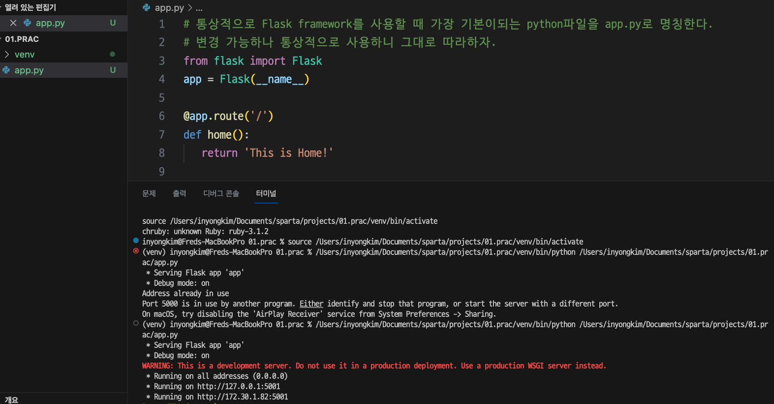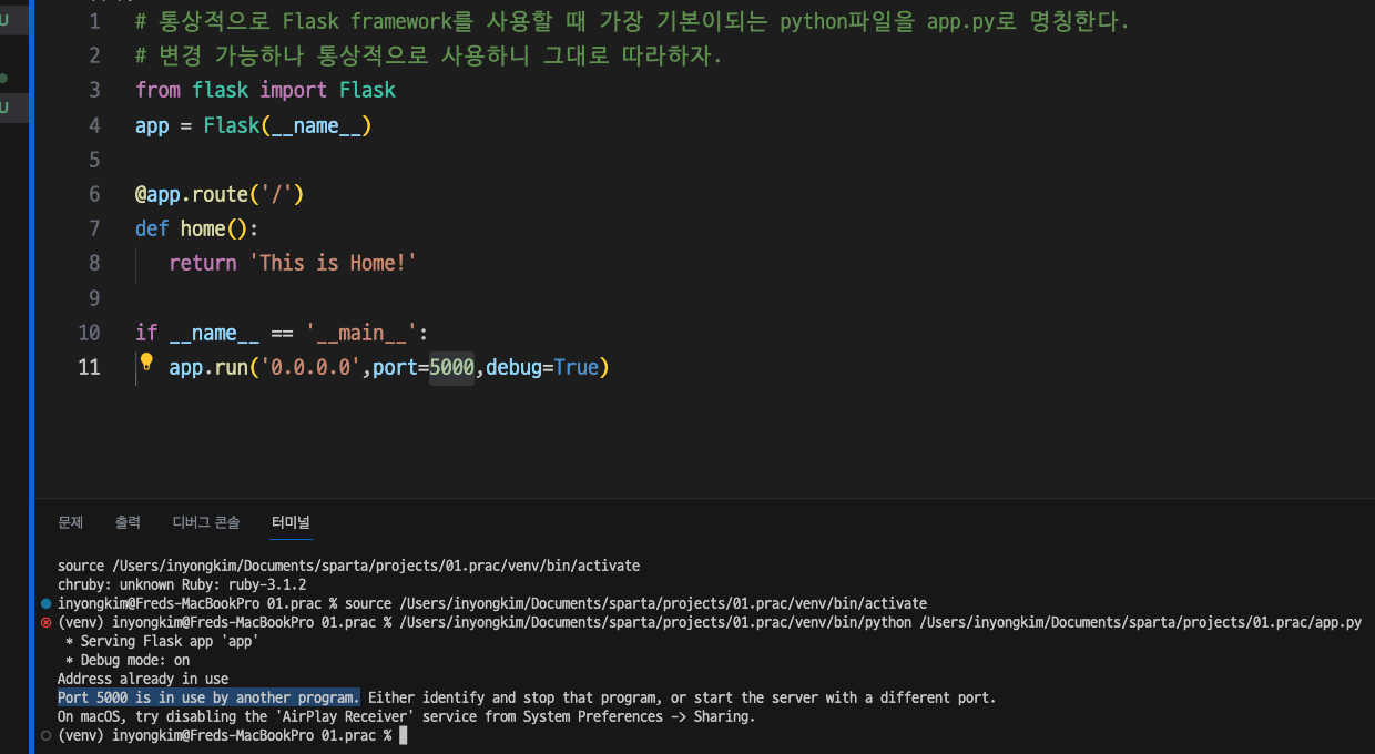 [Flask] Flask Framework 02 첫 사용 (서버만들기 -2), MacOS Port 5000 오류 해결