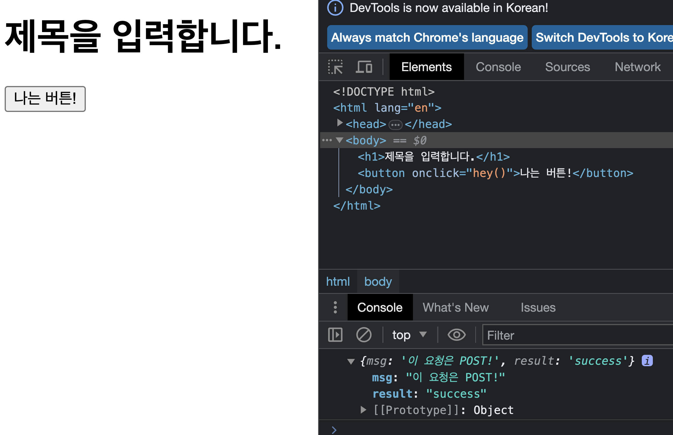 return jsonify({'result':'success', 'msg': '이 요청은 POST!'})