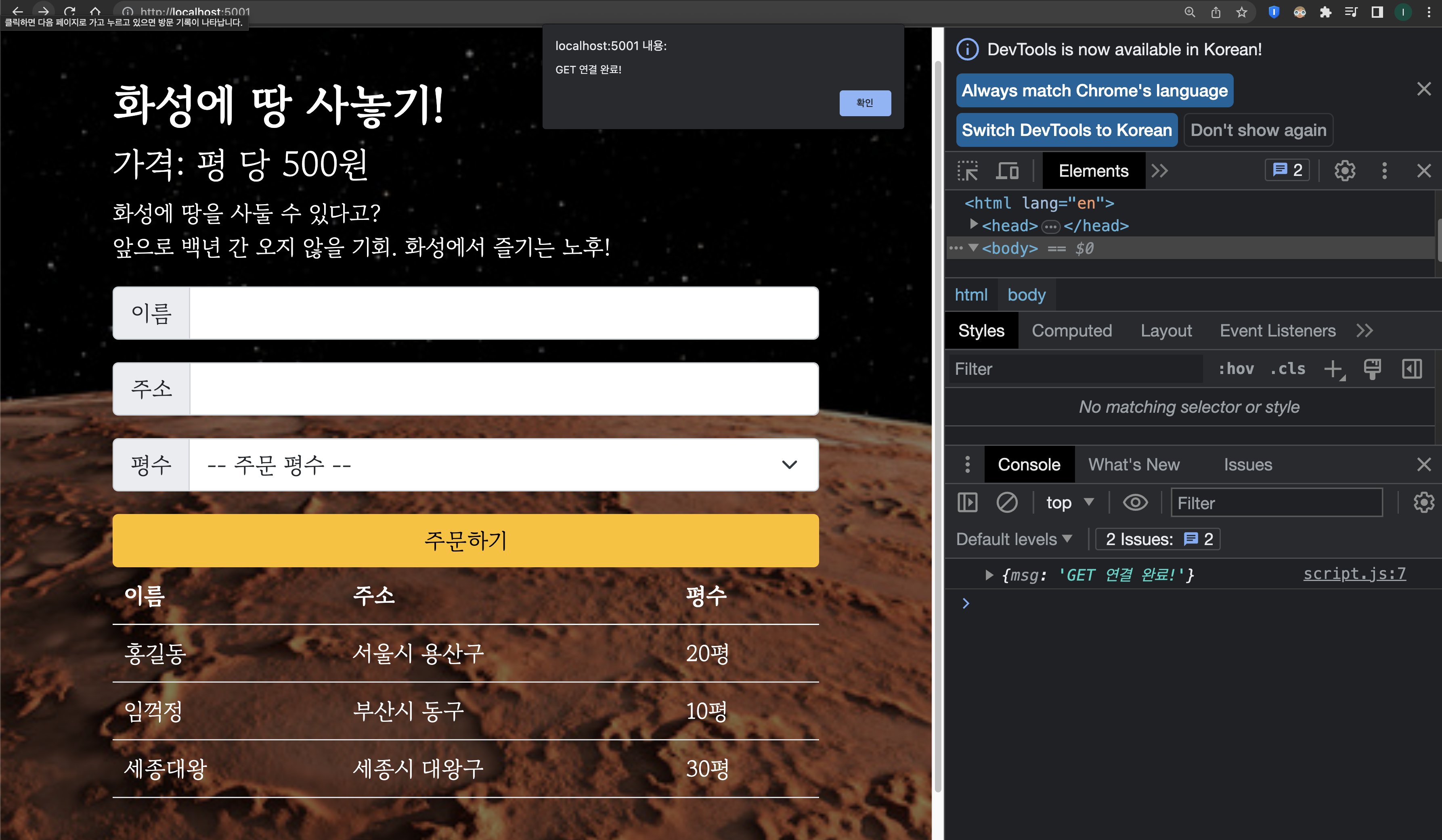 - show_order()내부 fetch()를 통해 '/mars' URL에 대한 GET 방식 요청