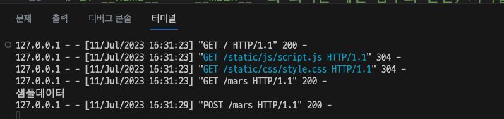 [Flask] Flask framework 미니프로젝트(project mars) 05 (Backend 기초 테스트 POST 요청 및 응답) 본문