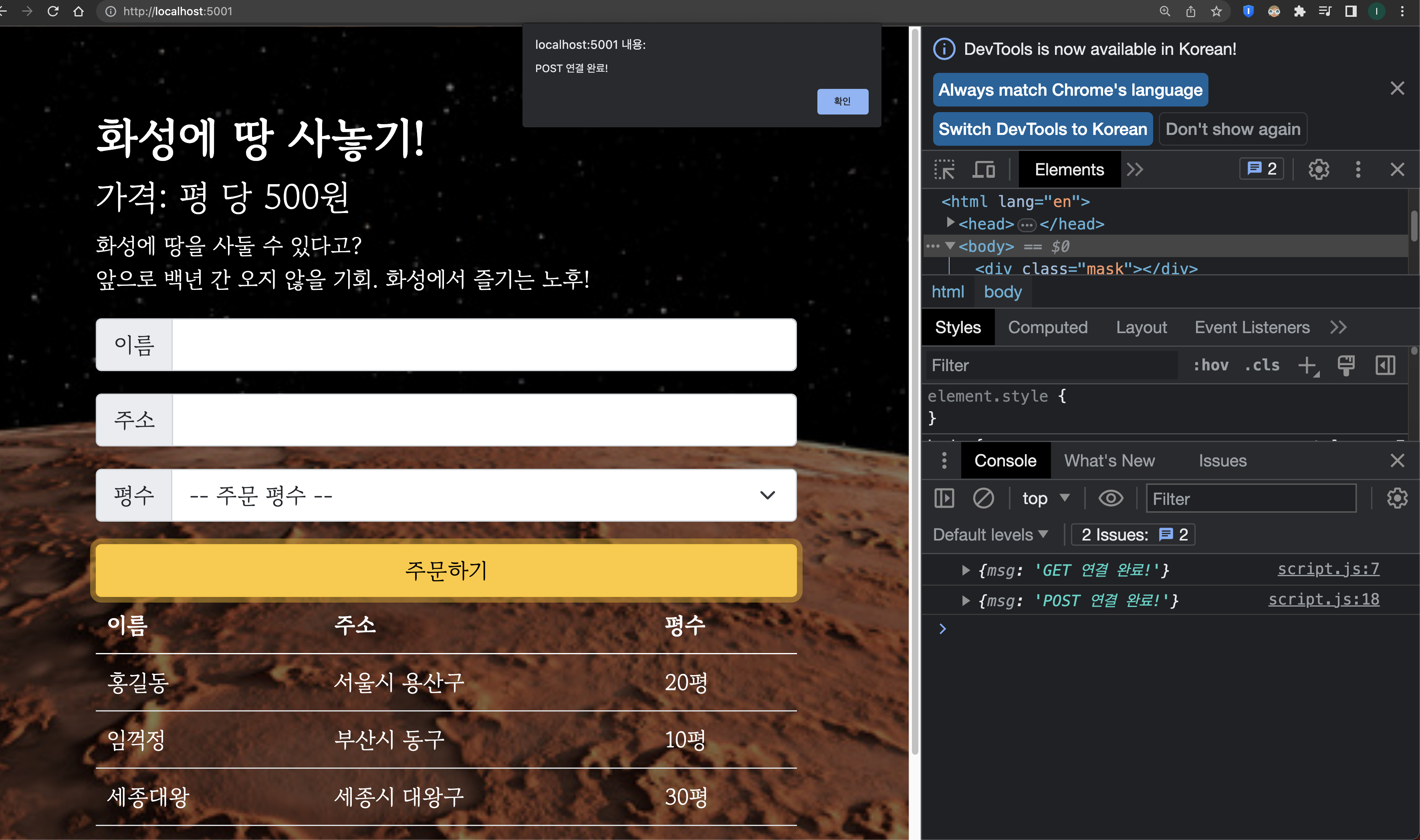 - save_order()내부 fetch()를 통해 '/mars' URL에 대한 POST 방식 요청 (+ 위 formData 객체를 body로 추가하여 요청함)