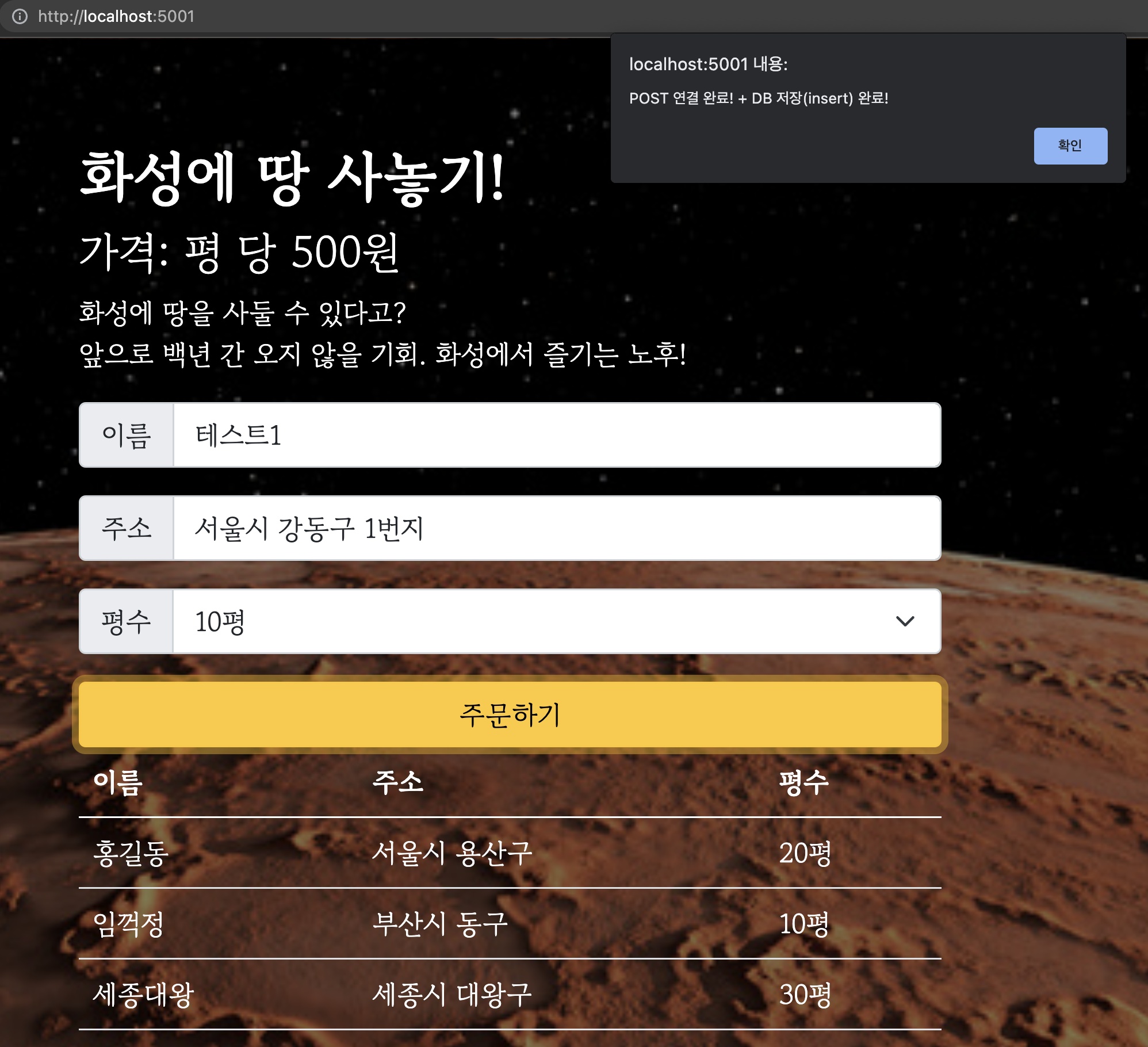 - save_order()내부 fetch()를 통해 '/mars' URL에 대한 POST 방식 요청 (+ 위 formData 객체를 body로 추가하여 요청함)