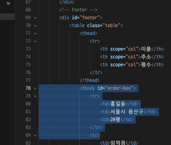 - index.html에 위 반복문의 결과인 임시 테이블 태그들이 한줄씩 #order-box라는 테이블에 반복문 결과인 테이블이 append 됨