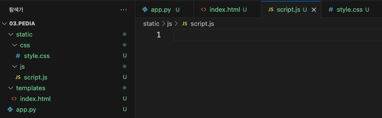 4. JS 모듈화 (root)/static/js/ 폴더 생성, JS용 script.js 생성