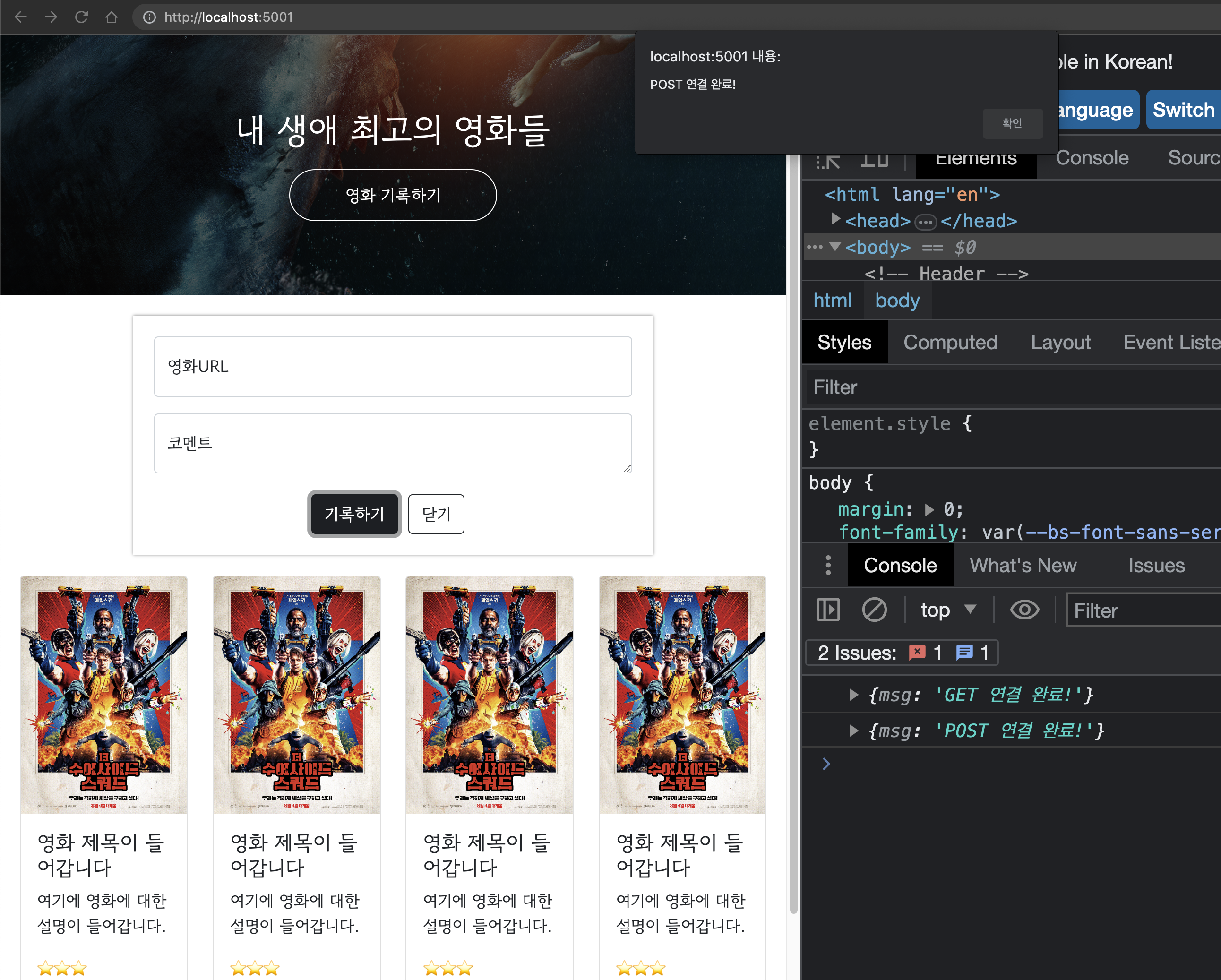 - posting()내부 fetch()를 통해 '/movie' URL에 대한 POST 방식 요청 (+ 위 formData 객체를 body로 추가하여 요청함)
