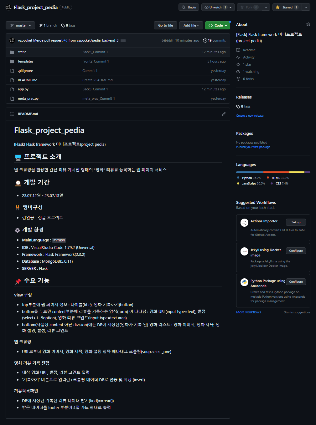 [Flask] Flask framework 미니프로젝트(project pedia) 09 (프로젝트 완료 및 형상, 버전관리) 본문