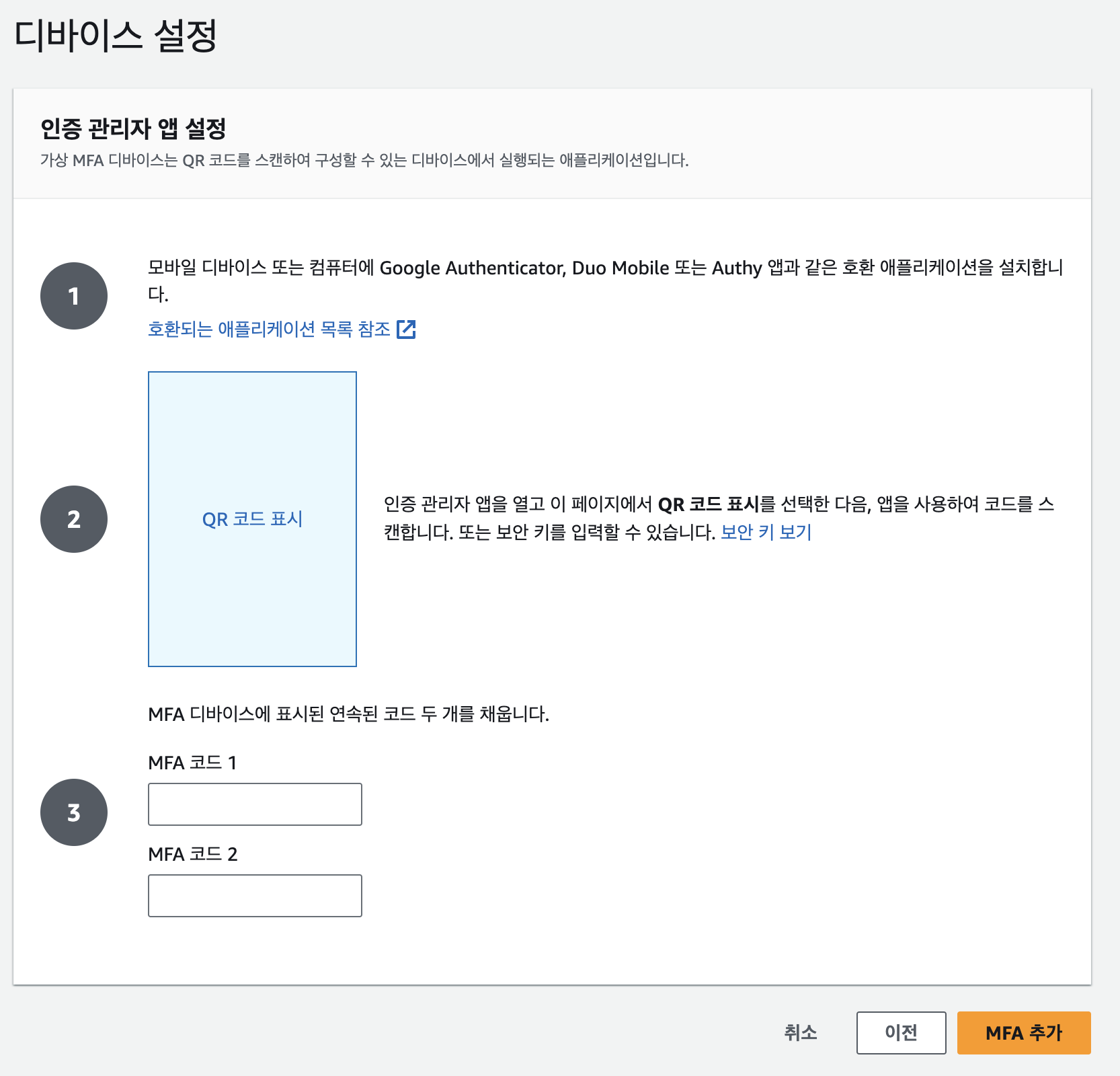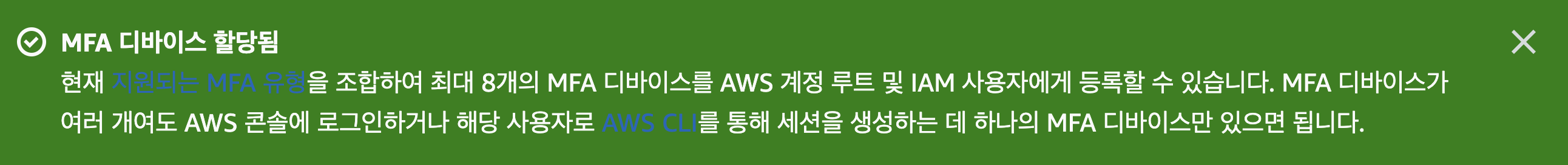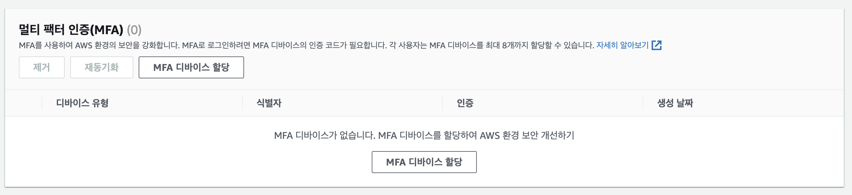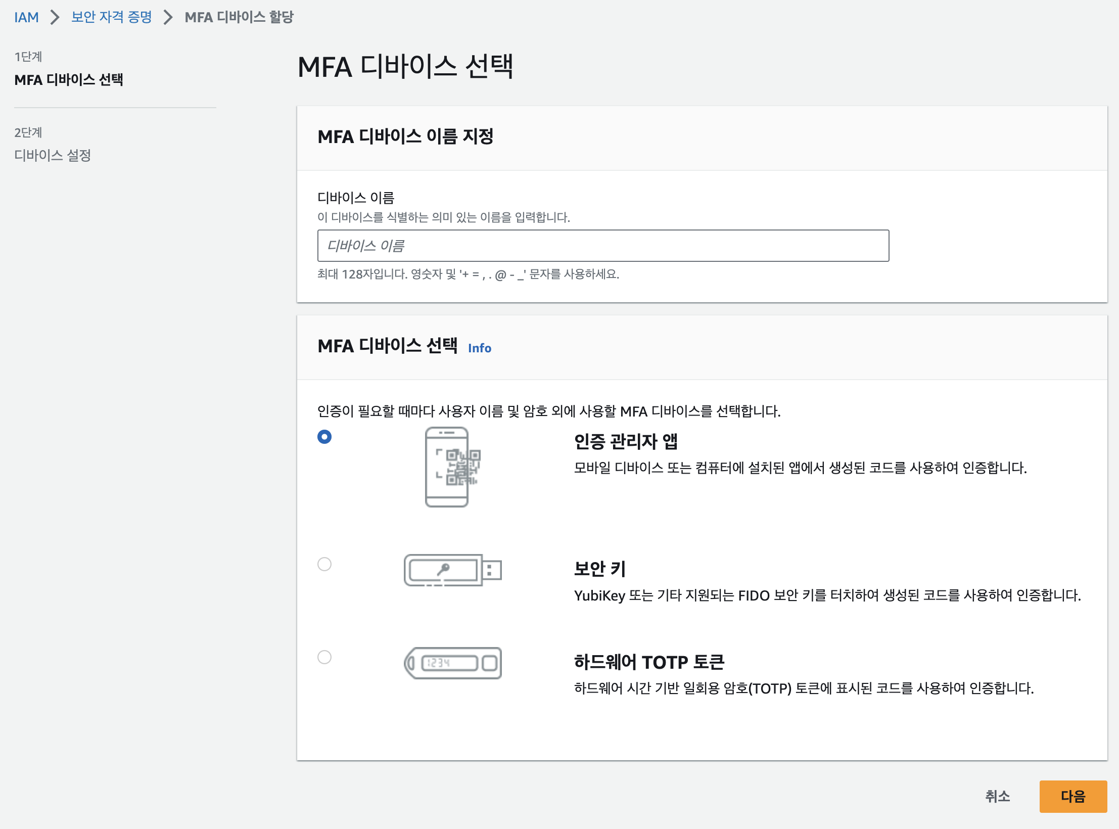 1. 콘솔홈>멀티 팩터 인증(MFA)>MFA 디바이스 할당
