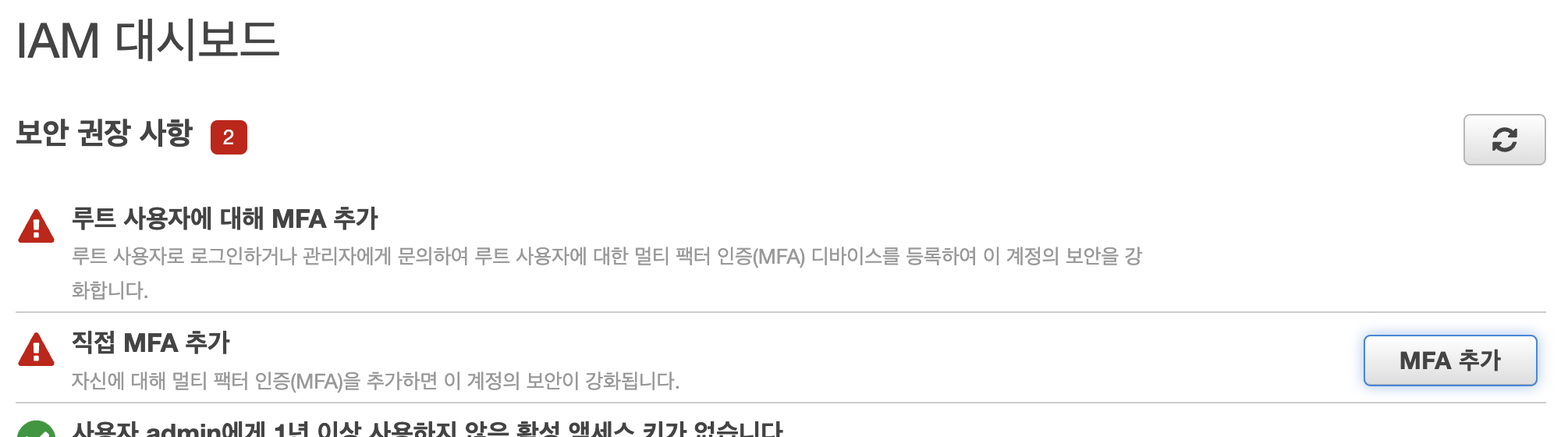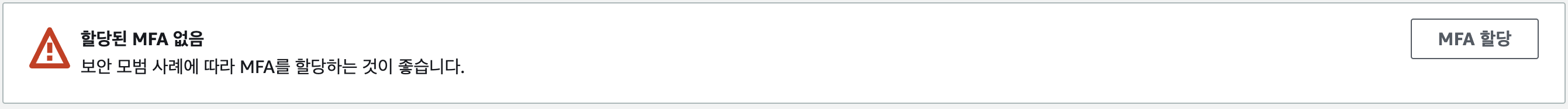 Identity and Access Management(IAM) 콘솔 홈이나 사용자 정보에서 다음과 같이 이곳 저곳에서 MFA가 없다고 경고문구가 등장한다.