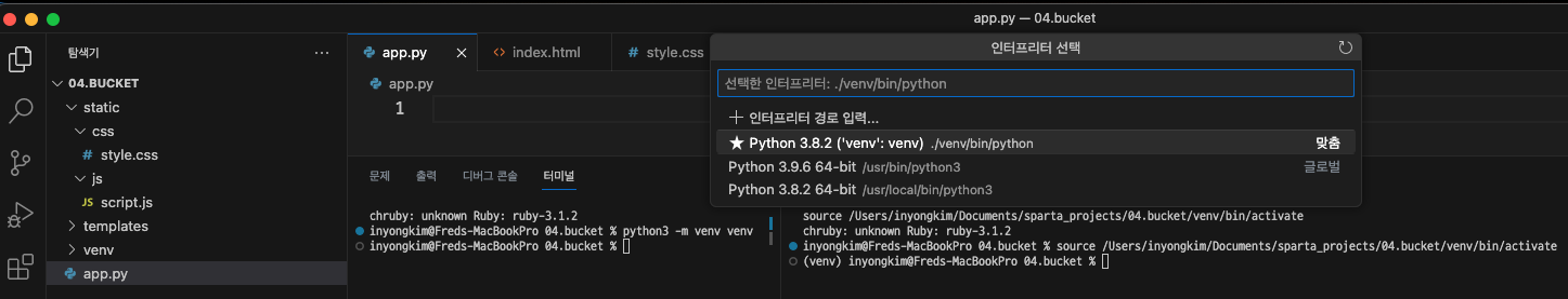 6. 인터프리터 python 3.8.2 버전 선택 후 (venv)가상환경 적용 터미널 열기