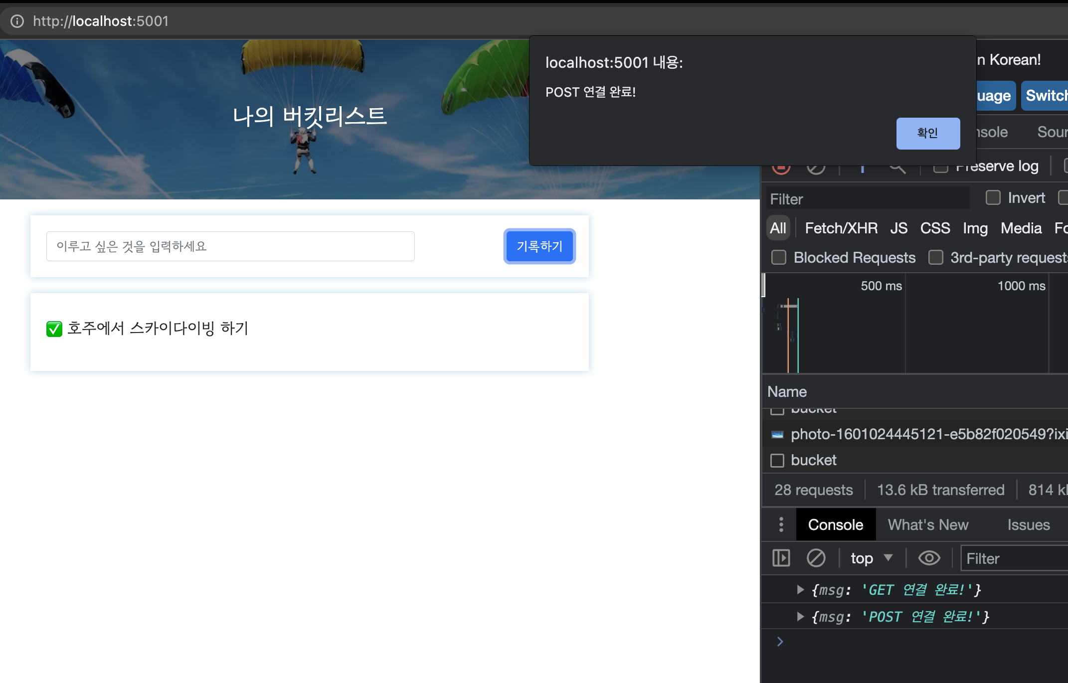 json->res->promise(res.json)->data로 변환되며 브라우저 콘솔과 알림창에 'POST 연결 완료'가 출력되는 모습이다.