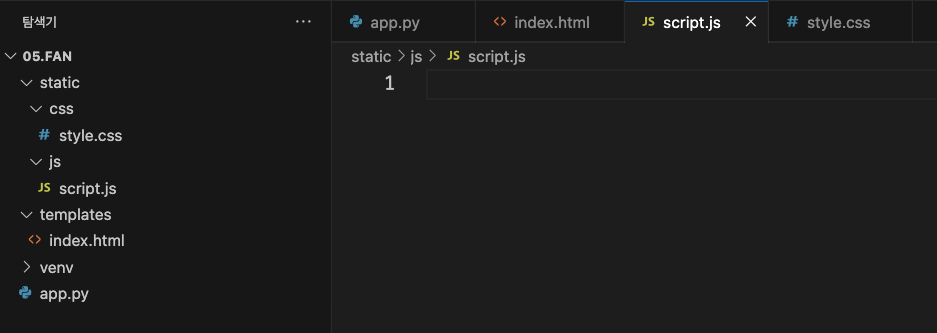 4. JS 모듈화 (root)/static/js/ 폴더 생성, JS용 script.js 생성