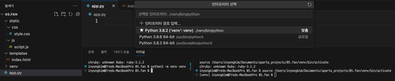 [Flask] Flask framework 미니프로젝트(project fan) 01 (초기 환경 구축)
