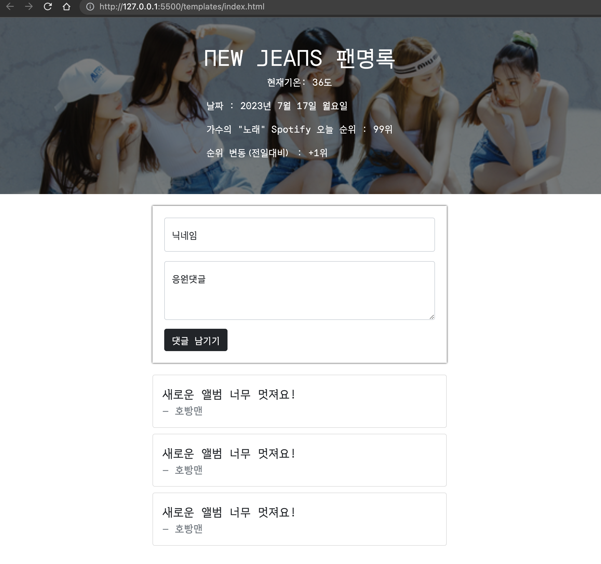 ohnyong 2023. 7. 17. 19:08새로운 앨범 너무 멋져요!개발하고자 하는 프로젝트의 View 페이지(HTML,CSS)와 JavaScript 연결 테스트용 작성