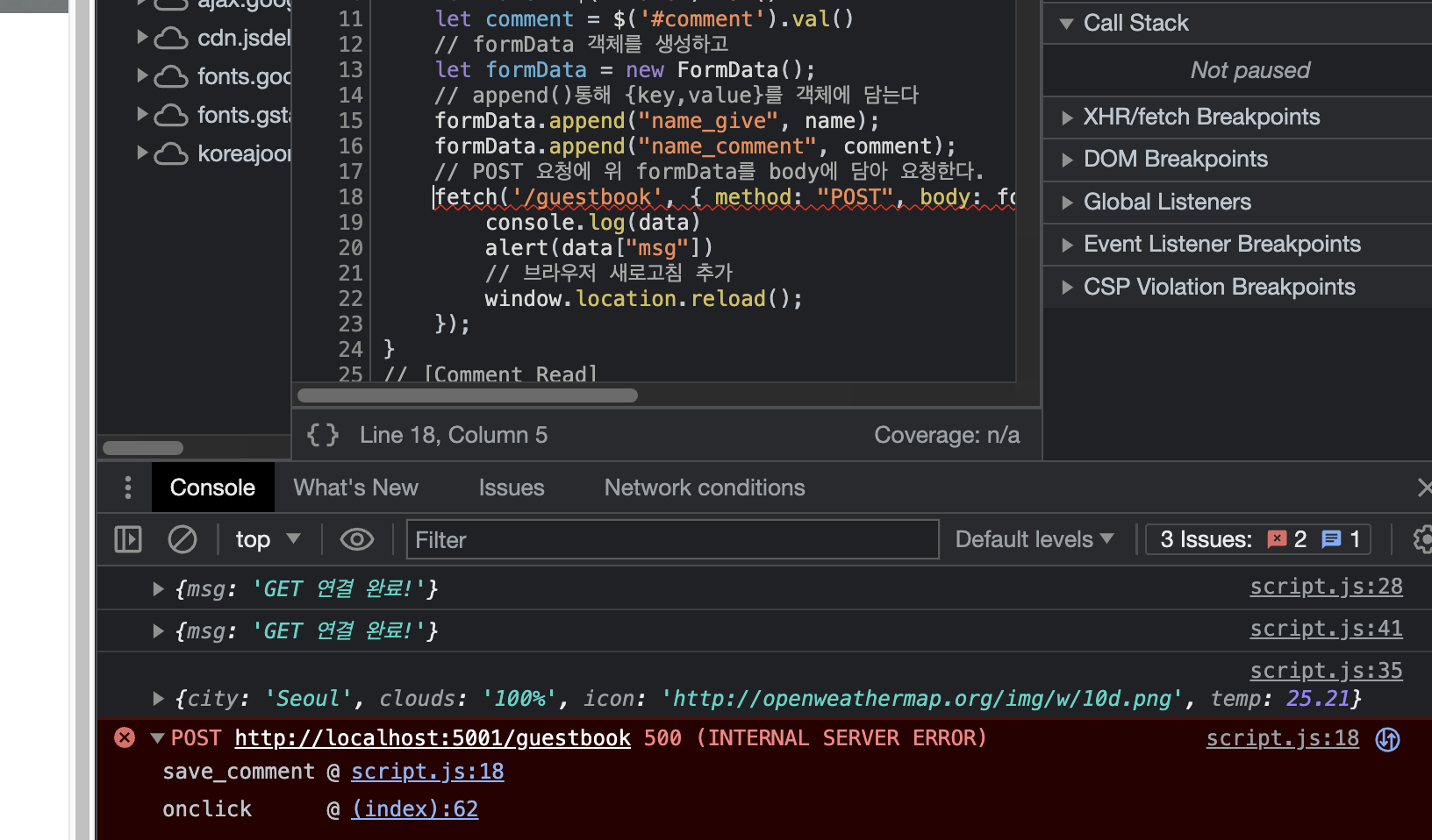 오류가 발생했지만, 500 에러는 서버 동작에서 발생하는 에러로 콘솔에 save_comment() 구문을 실행하는것에 이상이있다고한다.