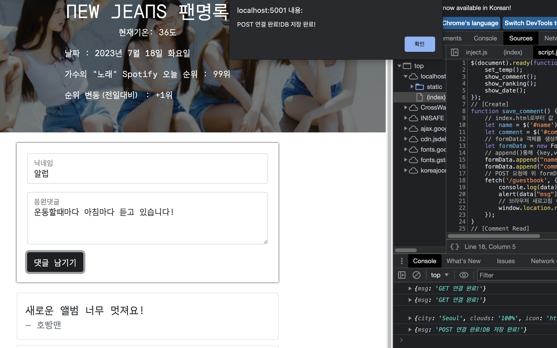 - 'POST 연결 완료! + DB 저장 완료!' 알림 창
