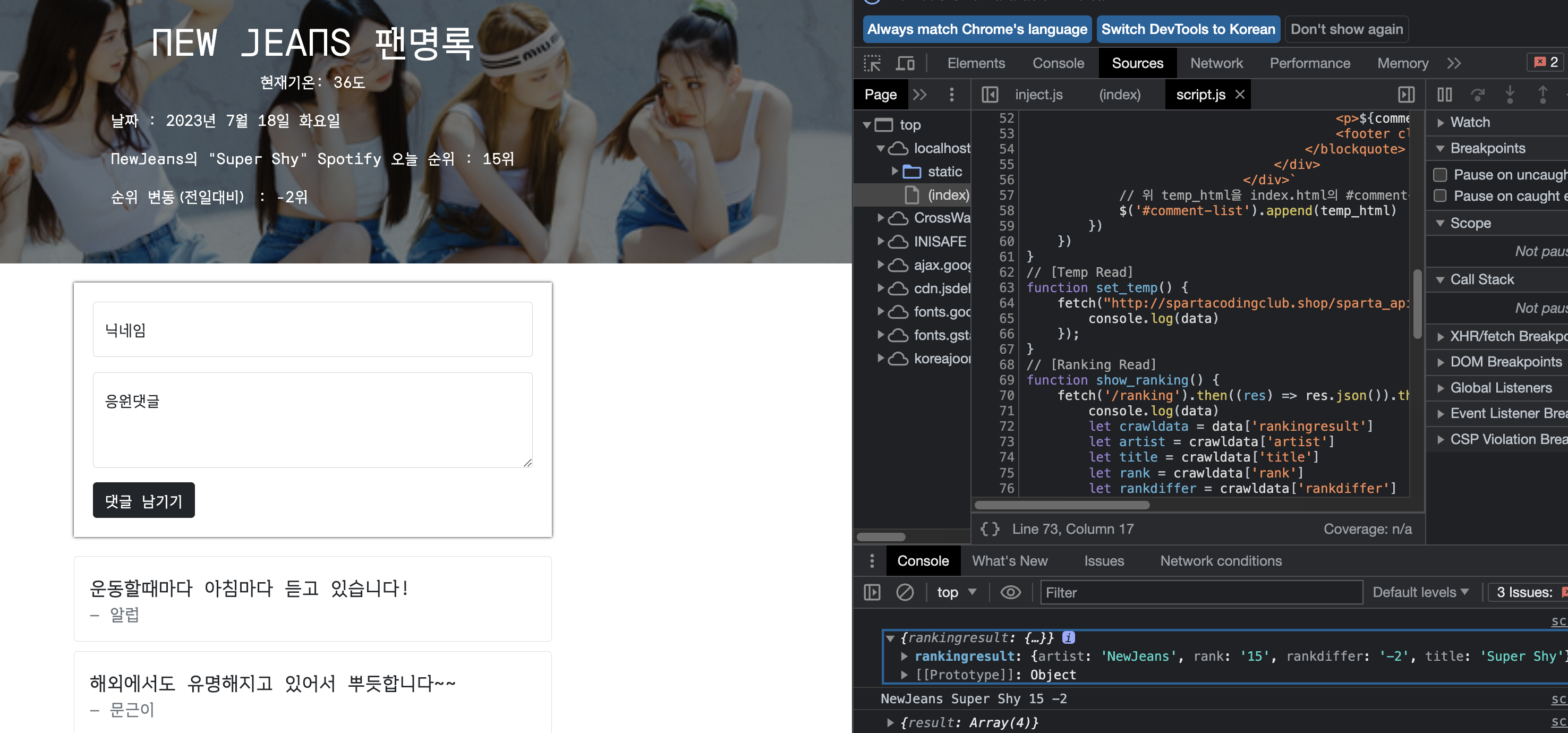 - show_ranking() 내부 fetch()를 통해 '/guestbook' URL에 대한 GET 방식 요청 app.py로 이동